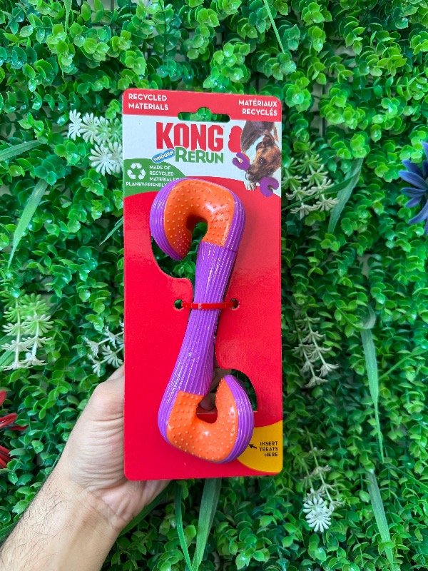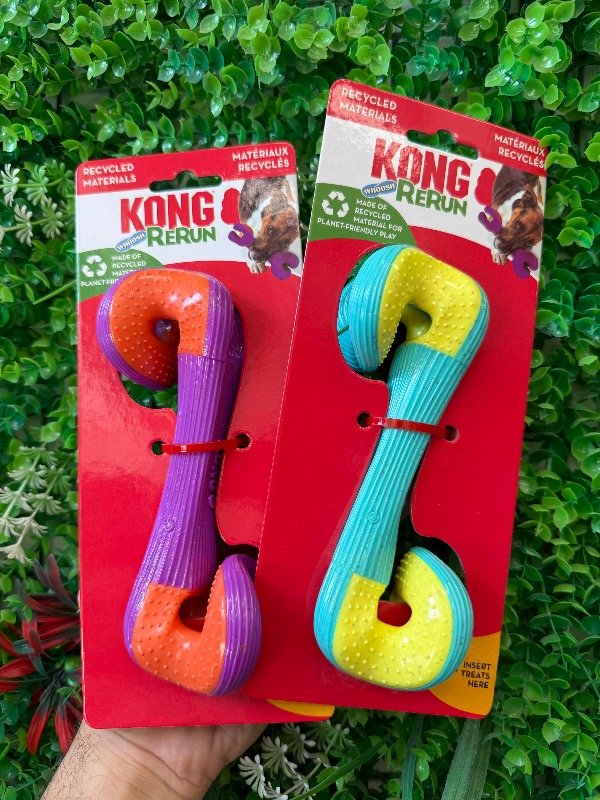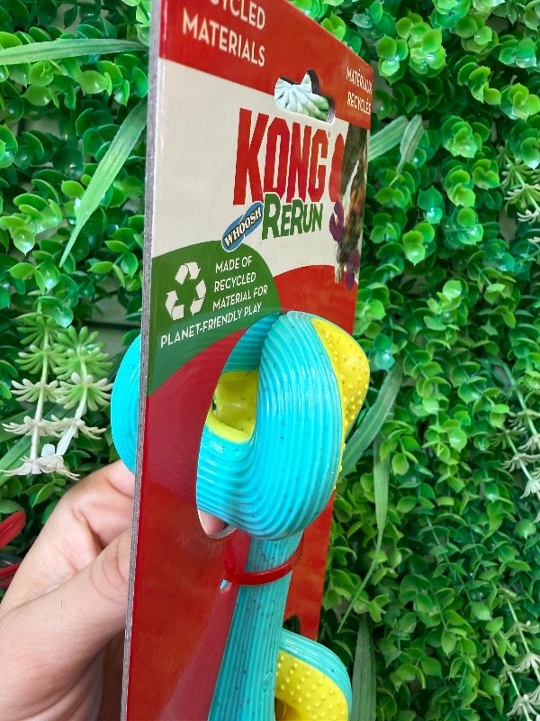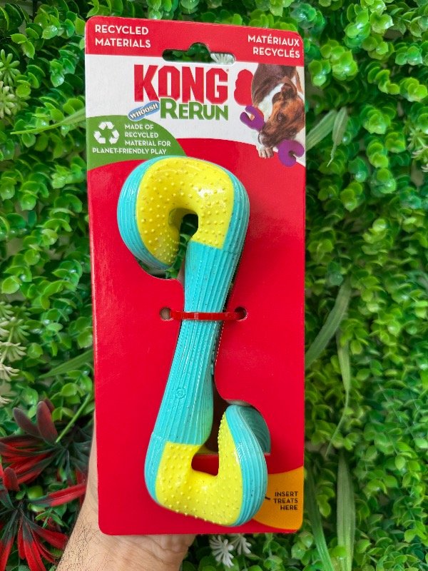 KONG Rerun Whoosh ofrece diversión y búsqueda con un lugar para guardar golosinas para recompensar a los cachorros desconcertantes. Con forma para que los perros lo sujeten cómodamente, las protuberancias especiales limpian los dientes y las encías mientras mastican. Un sonido único y sibilante despierta los instintos naturales de los perros, mientras que el rebote errático del juguete alimenta la diversión. Hecho con un 51 % de material reciclado para un juego respetuoso con el planeta.
