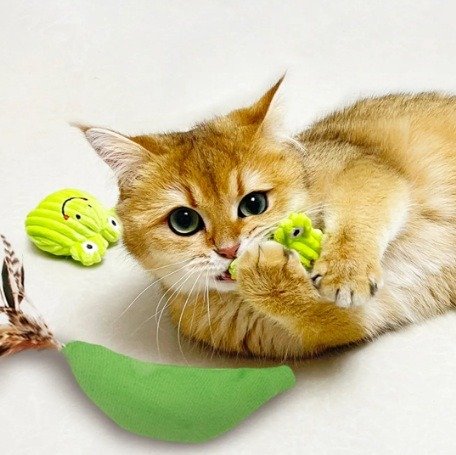 Está fabricado con felpa de alta calidad y bordados delicados, con un diseño adorable y duradero. Incluye pluma natural para estimular el instinto de caza, catnip premium orgánico y papel crinkle interno que emite sonidos al tocarlo, con sonajero exclusivo en el modelo rana.